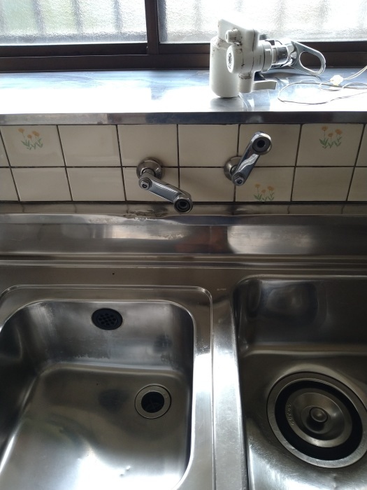 すでに配管を切断してキャップで仮止めし、混合水栓も取り外されている状態でした。