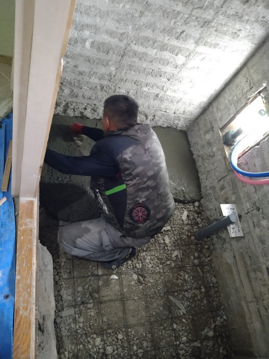 ユニットバス取り付けの床はコンクリート仕上げにするため、砕石を入れて固めていきます。