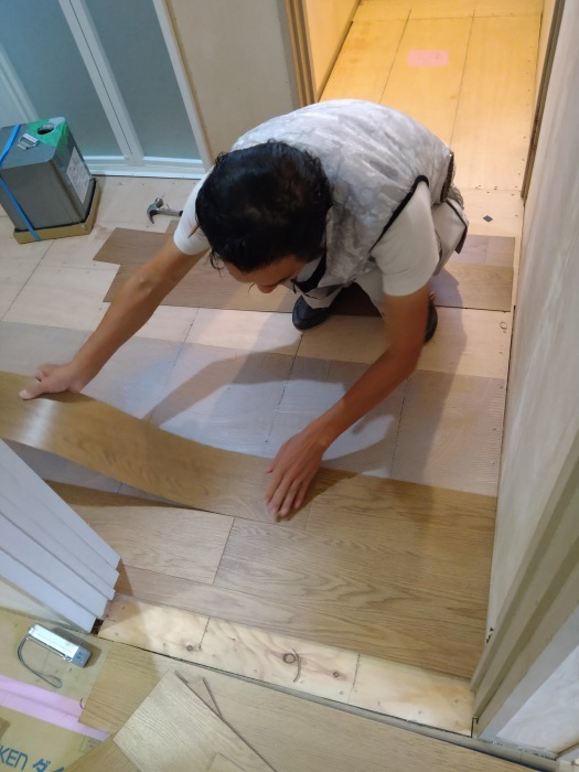 ベニア板の捨て張りがされ、フローリング材を張っていきます。