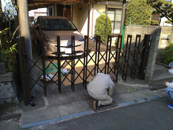 伸縮タイプの車庫門扉がスムーズに開閉できなくなり、ご相談をいただきました。