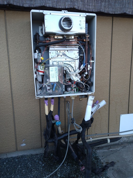 給水・給湯・ガス・追い焚き用の配管を取り外し、故障した給湯器を撤去します。
