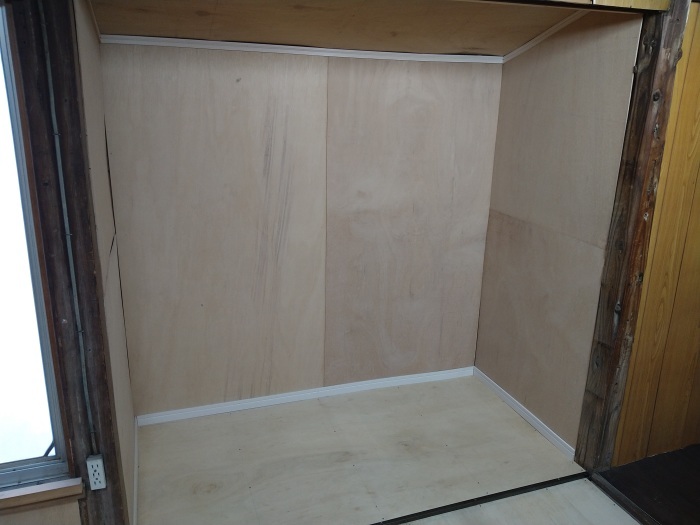 押し入れの床、壁、天井には新しいベニヤ板をていねいに重ね張りして仕上げ、見違えるようにきれいになりました。