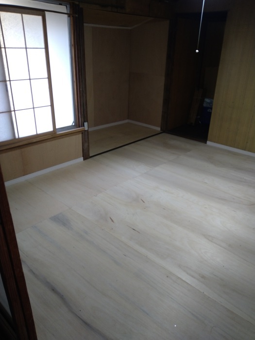 この後、お客様がご自身でクッションフロアを貼れるよう、平らなベニヤ板で仕上げます。