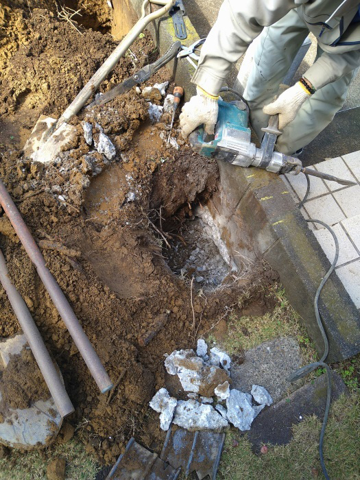 掘削中に既存ブロックの基礎コンクリートが出てきたため、これらを切断・ハツリながら所定の深さまで掘り進めました。