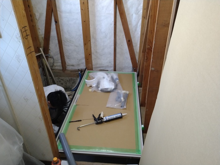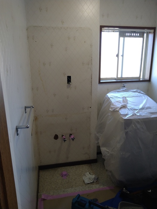 お風呂の設置が無事に終わり、いよいよ洗面所の内装リフォームです。