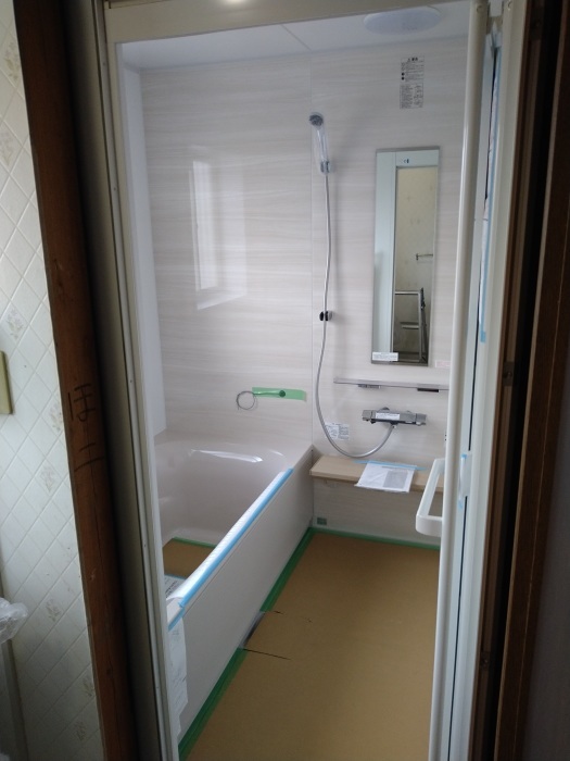 天井や壁パネル、鏡、水栓金具などの取り付けがすべて完了しました。