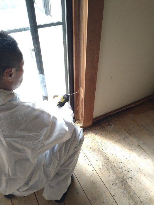 あわせて、被害の広がりを防ぐため、敷居や畳、床板の隅々に至るまで丁寧に薬剤を散布。