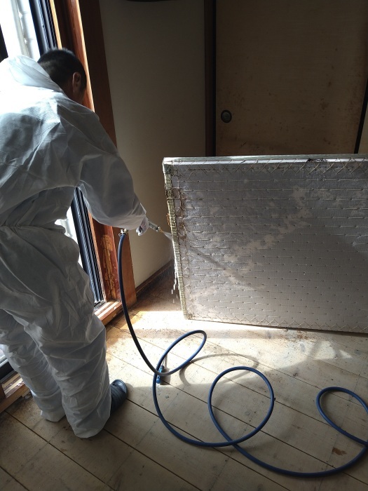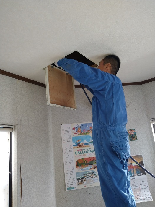 さらにLDKの天井裏からも和室天井への被害を確認したため、畳を寄せて床や柱を処置するだけでなく、天井裏にも薬剤を散布することになりました。
