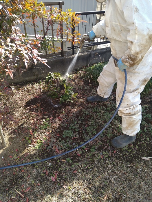 最後に、シロアリの発生源になりやすい庭の古い切り株や侵入経路となる建物の基礎回りにもしっかり薬剤を散布して駆除作業はすべて完了です。