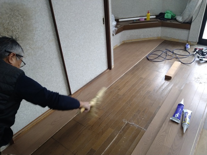 一枚一枚、隙間なく丁寧に貼り合わせていくことで、沈み込みのあった床が美しいフローリングへと生まれ変わっていきます。