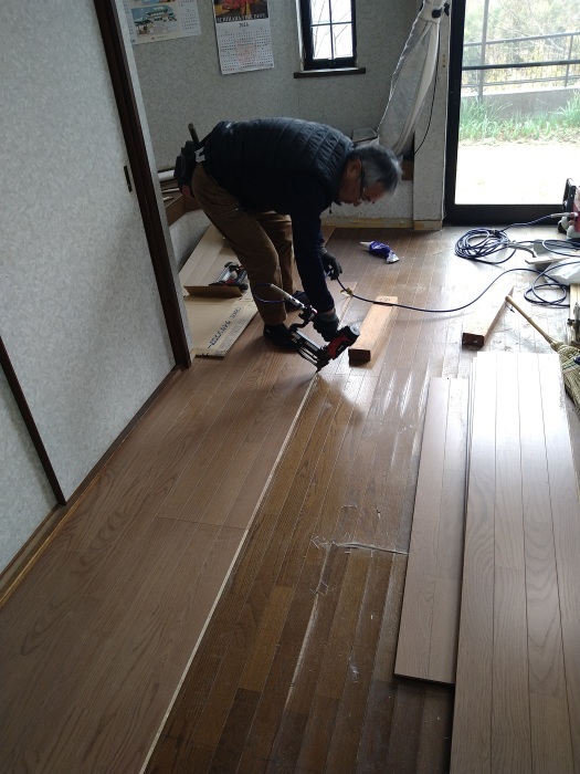 新しいフローリング材は、床専用のボンドと釘を併用して、一枚ずつ強固に固定していきます。