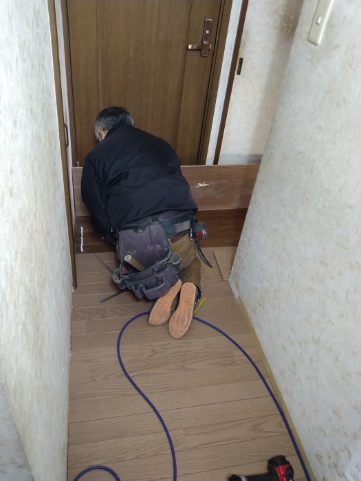 入り組んだドア枠や壁の凹凸に合わせ、床材をミリ単位で調整しながら丁寧に施工を進めていきます。