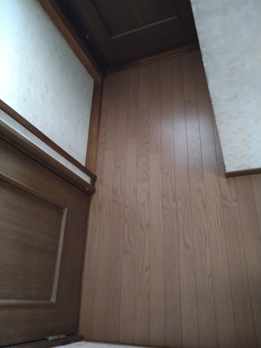 お客様とクッションフロアやフロアタイルも比較検討した結果、耐久性に優れたフローリングの重ね張りで進めることになりました。