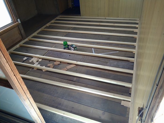 その差である48mmを埋めるために、まずは「根太(ねだ)」という木の骨組みで高さを底上げする作業から始めます。