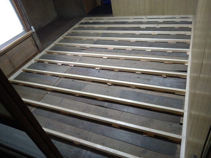 今回はベニヤ板での仕上げですが、もしこの上にフローリングを張る場合は、その厚みの分だけあらかじめ骨組みを低く調整しておきます。