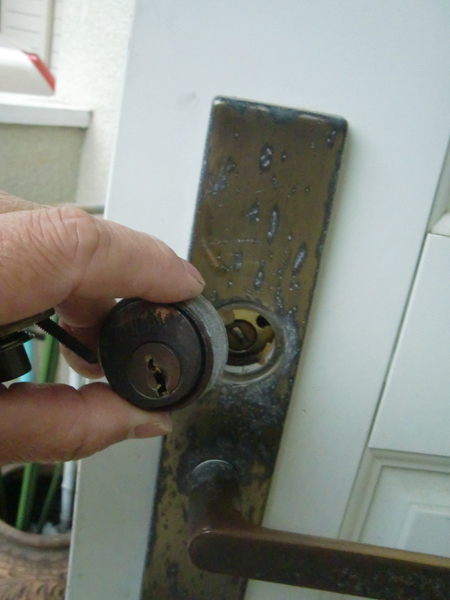 ![]() 玄関錠が入荷したので取り替えの工事に入ります。 | ![]() 内側のサムターン > 表側のシリンダー > 表と内側のハンドルと、取り外していきます。 |