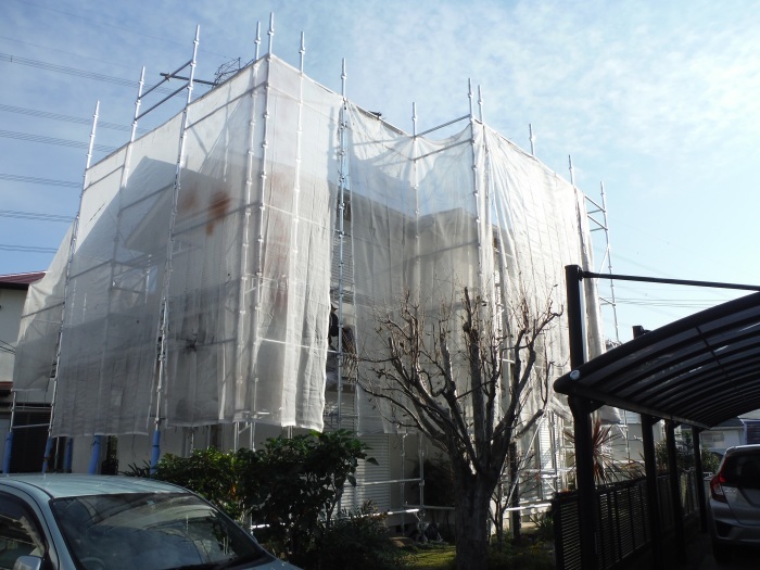 塗装では仮設足場を設置するため高所作業が可能です。