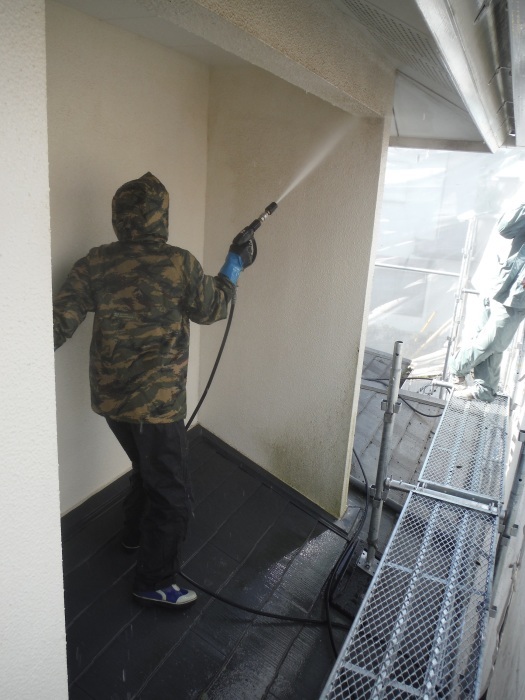 原因は建物の汚れ状態、風向き、隣家との距離、洗い方の作業方法など様々ですが、工事前に水洗の日程を連絡し、洗濯物を干さないようにお願いしております。