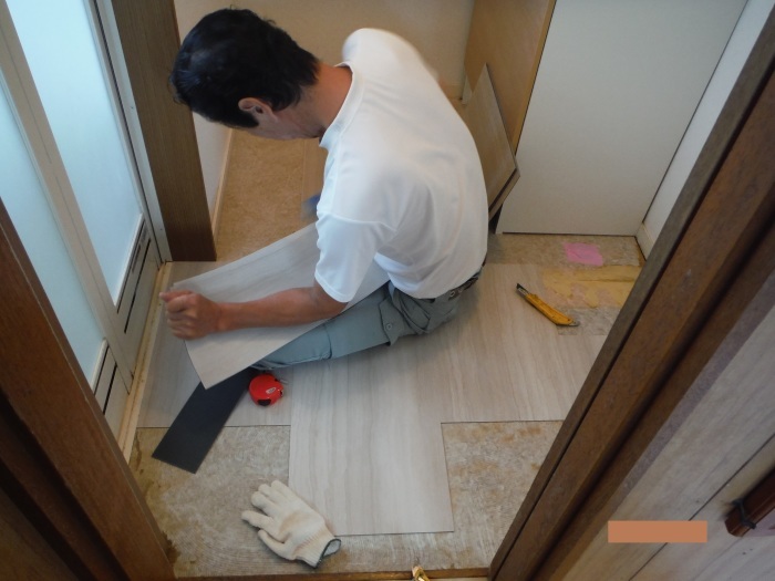 そこへ仮置きしたフロアタイルを順番に張り付けていきます。
