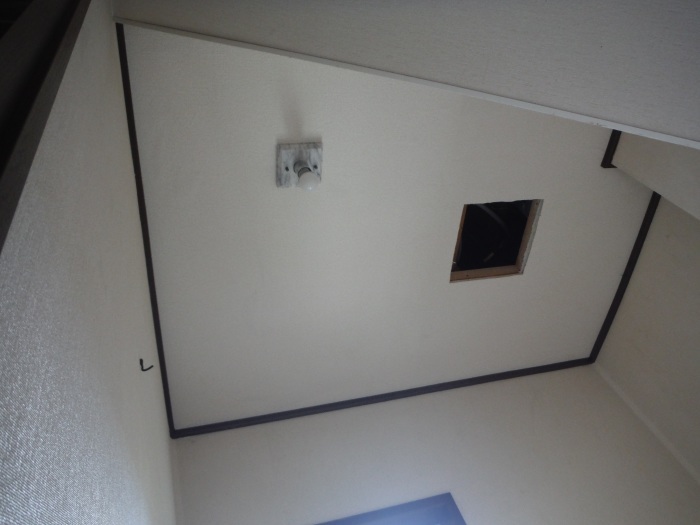天井の石膏ボードと回り縁を取外して天井裏と2階の床を確認しました。