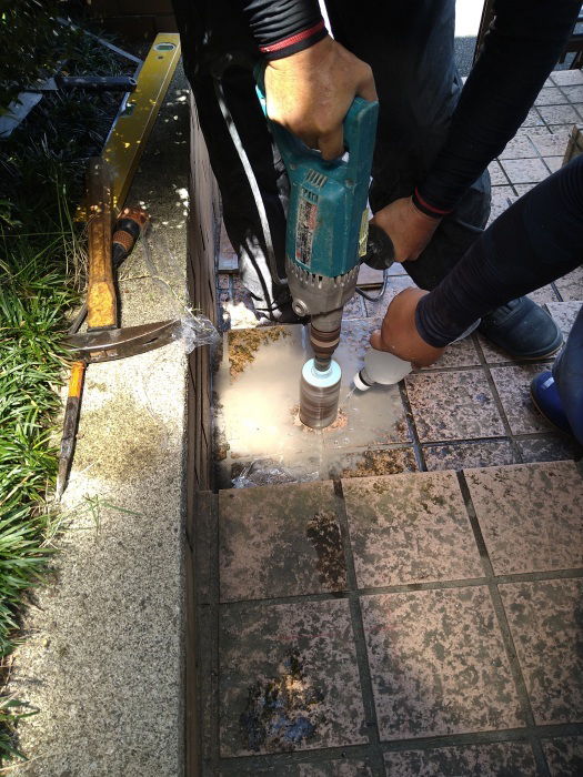 施工は手摺支柱を立てる穴をタイルの上からドリルで開けていきます。