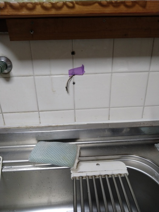 古いレンジフードを取り外すと、プロペラ換気扇を取り付けてあった四角い木枠が見えるようになりました。