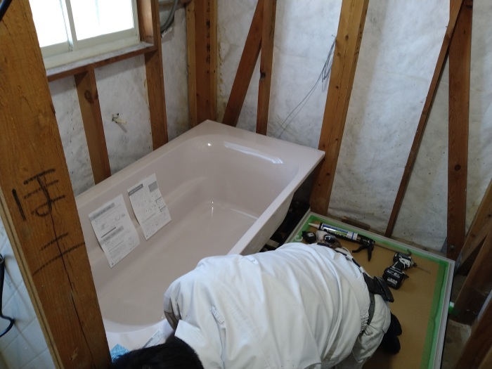 続いて、新しい浴槽を所定の位置へ丁寧に運び込み、しっかりと据え付けていきます。
