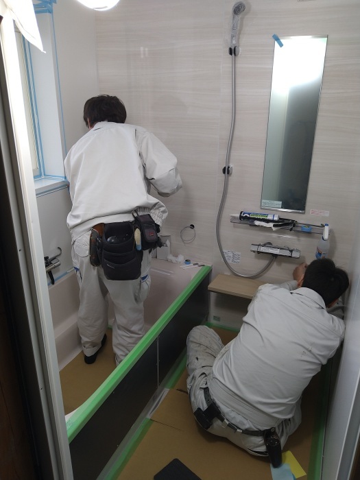 天井や壁パネル、鏡、水栓金具などの取り付けがすべて完了しました。