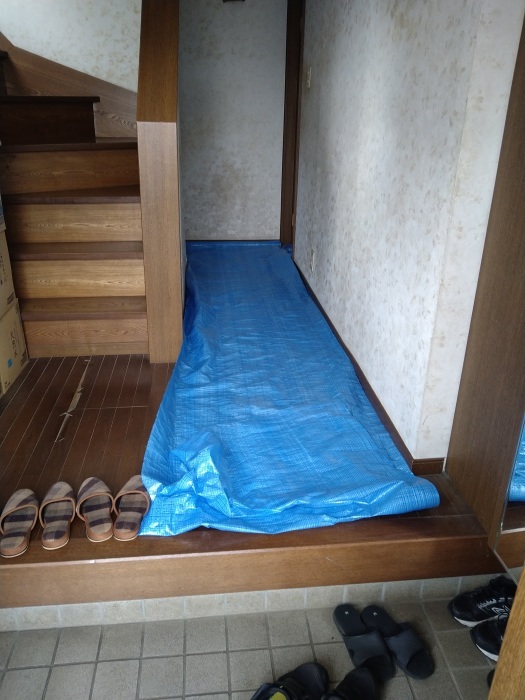 万全の準備を整え、まずは玄関から床が傷つかないよう丁寧に養生(保護)を行い、いよいよ工事開始です。