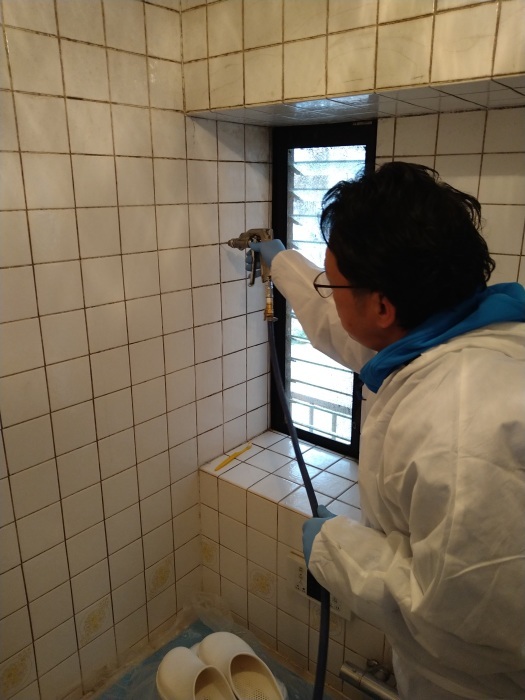 玄関と同様に左右のドア枠へ薬剤を注入し、さらにタイルの壁にも6箇所の穴を開けて、壁の内部まで薬剤をしっかり注入しました。