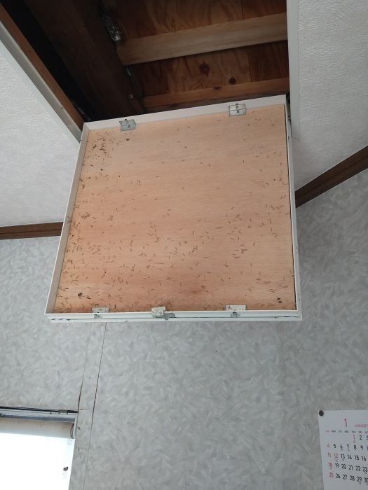 LDKの天井点検口を開けて調査したところ、シロアリの羽が多く落ちているのを発見しました。