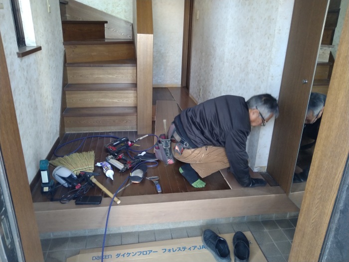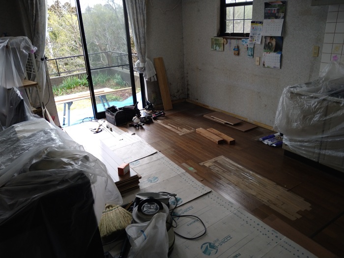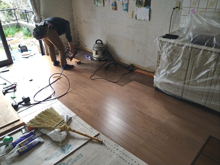 LDKの時と同様に、まずは幅木(はばき)を取り外してから、フローリング材を重ね張りしていきます。