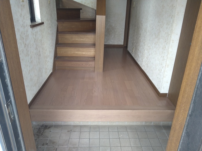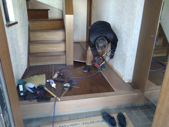玄関廊下の床工事も無事に終了し、最後に取り外していた幅木(はばき)を新しく付けて完成となりました。